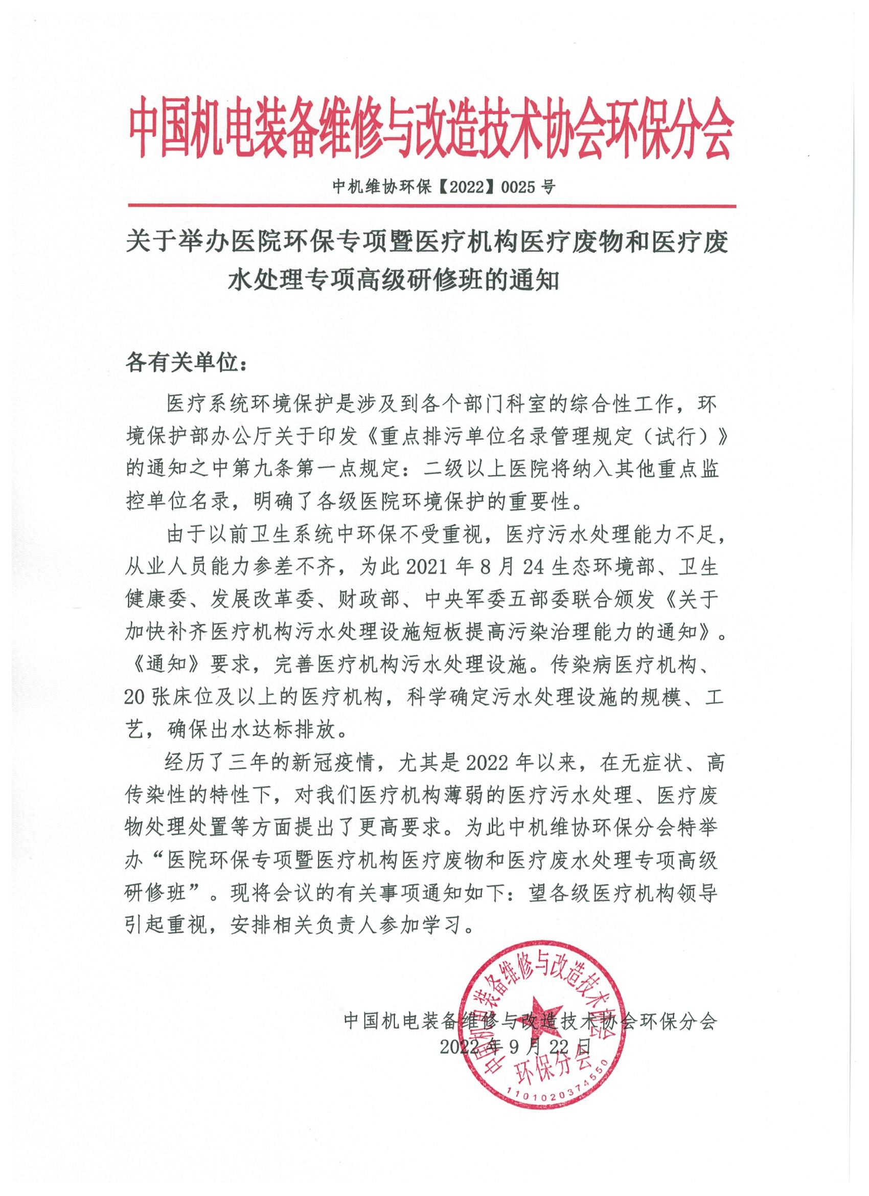 關(guān)于舉辦醫(yī)院環(huán)保專(zhuān)項(xiàng)暨醫(yī)療機(jī)構(gòu)醫(yī)療廢物和醫(yī)療廢水處理專(zhuān)項(xiàng)高級(jí)研修班的通知!