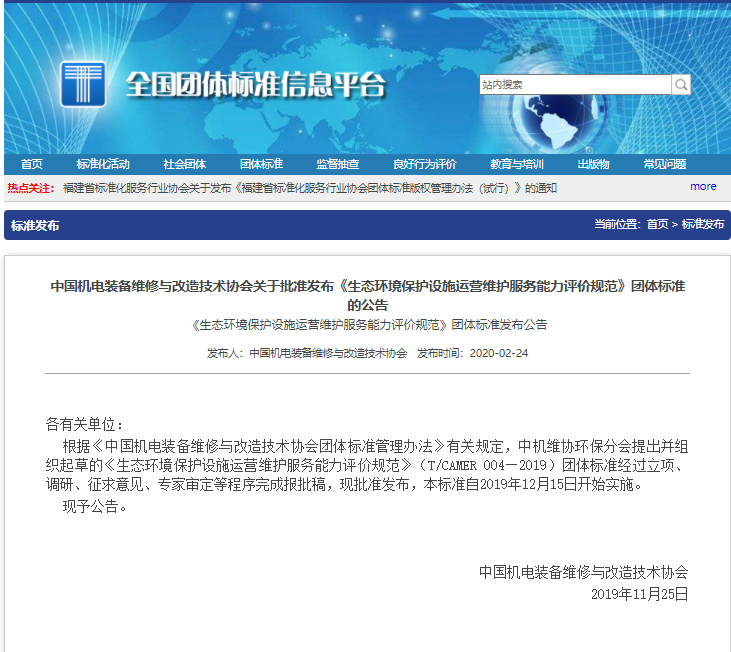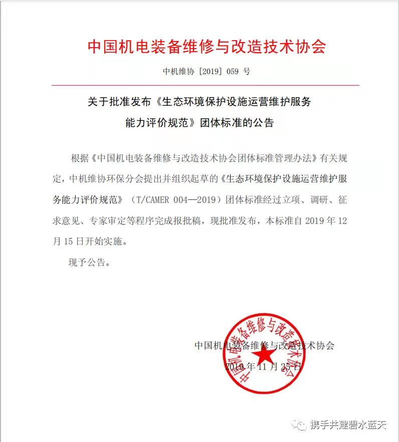 由中國機電裝備維修改造技術(shù)協(xié)會發(fā)起,聯(lián)合河北省環(huán)保治理運營行業(yè)協(xié)會、佛山市中環(huán)環(huán)保技術(shù)研究中心、中機國際工程設(shè)計研究院有限責(zé)任有限公司華東分院、廣東敏義環(huán)境科技有限公司、深圳市環(huán)境治理光電產(chǎn)業(yè)有限公司、佛山攸威光電科技有限公司、山東領(lǐng)先機械制造有限公司、山東濟寧精誠科技有限公司、山東棗莊遠(yuǎn)程環(huán)??萍加邢薰?、石家莊科林威爾環(huán)保科技有限公司以及石家莊曼特水處理有限公司共同起草的《生態(tài)環(huán)境保護設(shè)施運營維護服務(wù)能力評價規(guī)范》團體標(biāo)準(zhǔn),于2019年11月25日獲批發(fā)布,并于2019年12月15日正式實施。